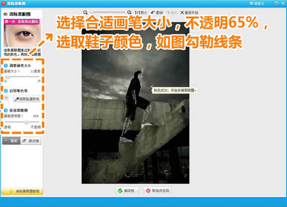 2、接着继续选择“消除黑眼圈”功能,取鞋子的白色,并调节较小的画笔勾勒一下四肢和脸部的轮廓。