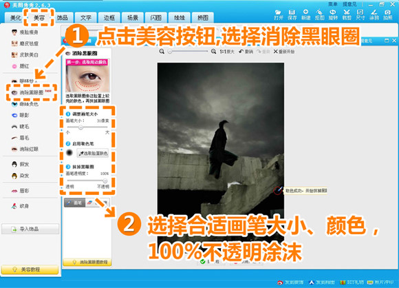 1、在软件下打开待处理的照片,进入“美容”菜单下,选择“消除黑眼圈”功能,选择周围的颜色将四肢和脸部涂抹掉,仔细一点要尽量让涂抹掉的地方和背景统一。