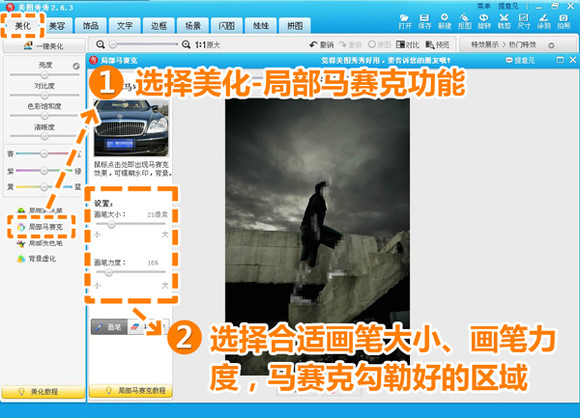 3、返回“美化”菜单下,选择“局部马赛克”按钮,模糊刚才画的轮廓线条。