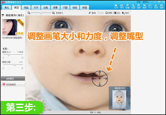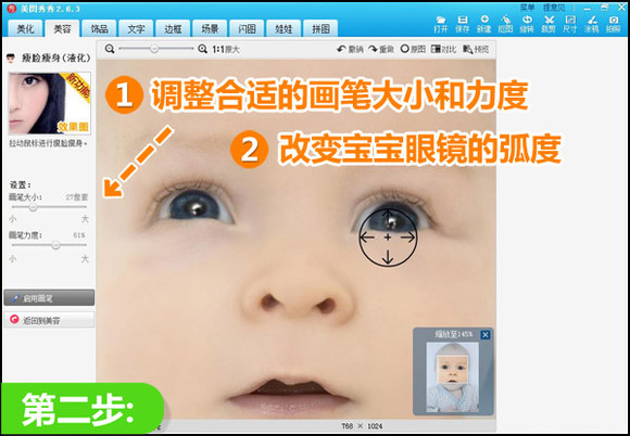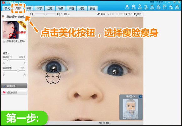 1.处理前,首先需要下载安装“美图秀秀”软件,启动后打开一张宝宝照片,进入“美容”菜单,选择“瘦脸瘦身”(液化)来处理眼睛。可以将图片放大,方便细节处理。