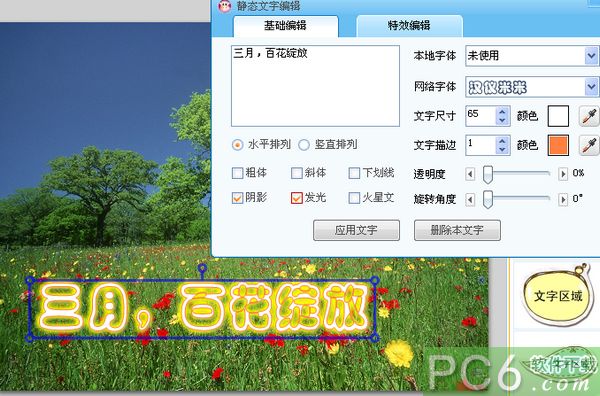 你可以选择本地已经安装过的字体文件,或者选用可牛影像自带的华康、汉仪、方正等艺术字体。将文字编辑区域选定后输入你想说的话,随后调整字体的透明度、旋转角度等参数,下图是初步的编辑效果: