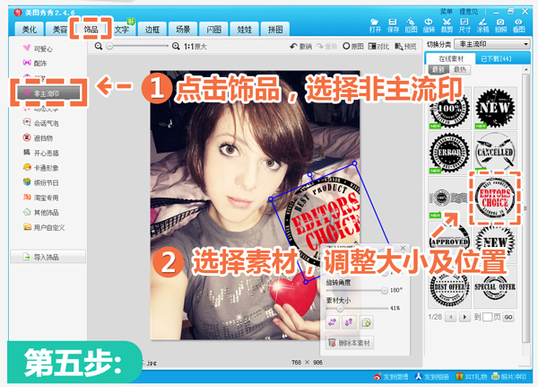 5、然后为了营造照片的艺术效果,可以进入“饰品”菜单下,选择一些好看的非主流印。添加素材后,可调整一下其大小和位置。