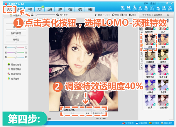 4、然后返回“美化”菜单下,选择LOMO-淡雅特效,适当调整其特效透明度到40%。