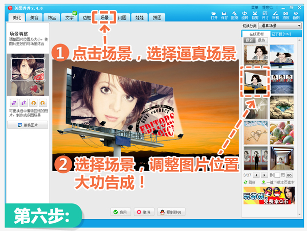 6、最后,到“场景”菜单下,选择“逼真场景”分类,在右侧缩略图中即可看到一些巨型海报的场景,点击选中,适当调整一下场景图片的显示区域,就大功告成啦!