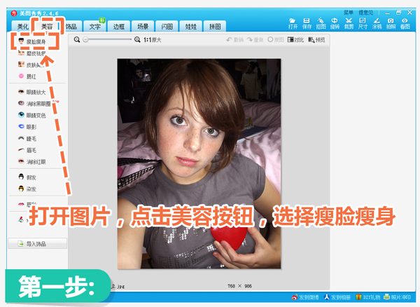 1、在“美图秀秀”软件中打开一张待处理的照片,大饼脸和那些烦人的雀斑怎么也看不出明星相。不过别着急,我们可以先美美容,进入“美容”菜单下,选择瘦脸瘦身功能。