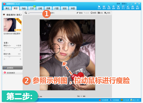 2、进入“瘦脸瘦身”界面后,用鼠标将脸部边缘往内侧拉动,就会发现脸真的有变瘦哦!不过这个瘦脸操作起来要仔细一点,不然变形的脸就不好看啦!