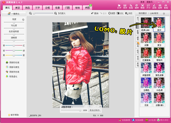 第二步:运用“LOMO”中的“胶片”特效,透明度为100%。