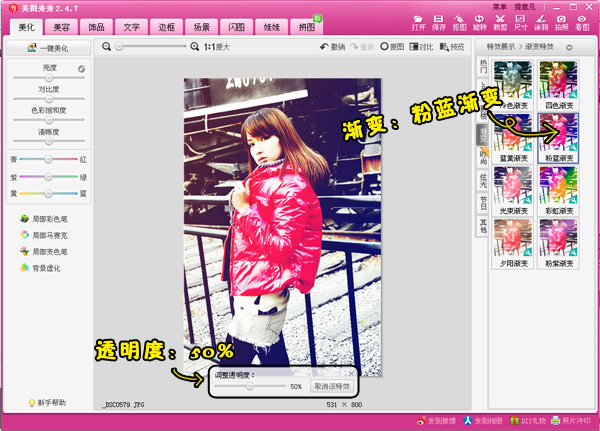 第四步:加上“渐变”分类中“粉蓝渐变”,透明度为50%。