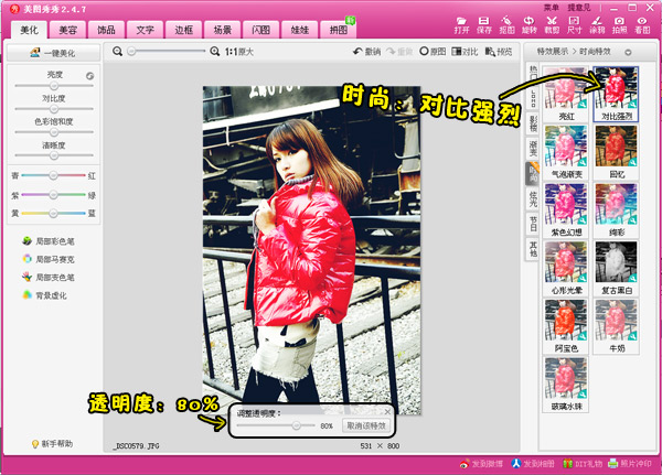 第三步:再应用一个“对比强烈”特效,透明度80%,加深图片的明暗、深浅对比。