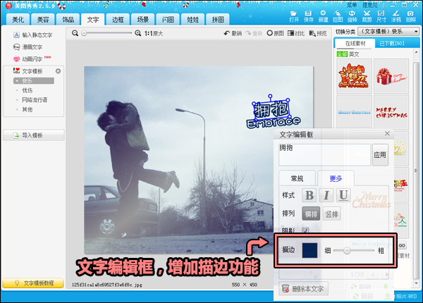 在制作新的文字编辑框基础上,增加文字描边功能。选定字体,输入文字后,可以调节描边粗细,并用习惯吸取描边的颜色,非常方便。