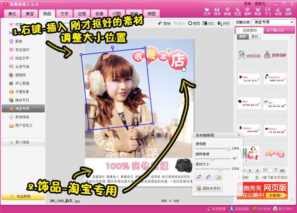 3、接着到“饰品”菜单下,给原来的照片添加一些“淘宝专用”的素材。并对照片点击鼠标右键,选择“插入一张图片”,将刚才抠好的素材添加进来,并调整其大小位置。为了让摇头晃脑的效果看起来富有喜感,可以将头像调的比之前大一点。