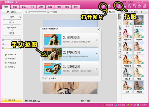1、首先在“美图秀秀”软件下,打开一张自己的照片,并点击界面右上角的“抠图”按钮,在跳出来的菜单中选择“手动抠图”模式。