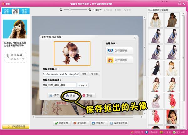 2、利用左侧实例图的提示,仔细用鼠标将头像抠取出来。抠好后点击“保存抠好图片”,将抠出的头像保存起来。