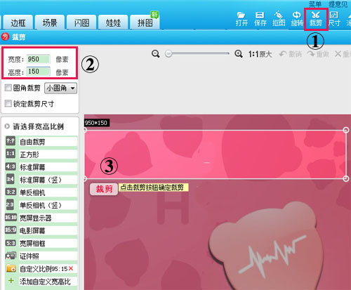 首先要了解旺铺店招的相关规格,文件格式:GIF、JPG、JPEG、PNG,文件大小:100K以内,建议尺寸:950px*150px。所以先准备一张背景图,点击界面右上侧“剪裁”功能,定义尺寸进行剪裁。