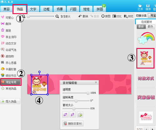 进入“饰品”菜单下,点击“淘宝专用”分类,在右侧素材展示栏中选择合适的饰品素材,并添加进图片,要适当地调节一下素材的大小和位置。