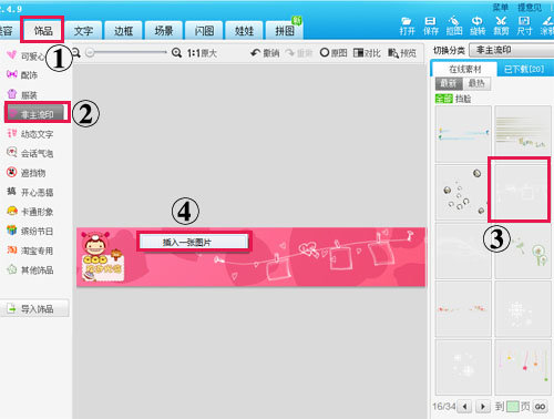 再点击“非主流印”分类,在16页下找到添加漂亮的“衣架”素材,并添加进图片。然后点击鼠标右键,选择“插入一张图片”。