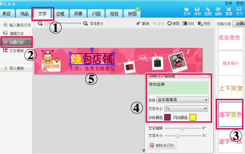 再进入“文字”菜单下,选择相应的文字模式来编辑店铺名称。当然为了让店铺名称更加醒目,可以选择“动画闪字”,而且有多种闪动模式可供选择。
