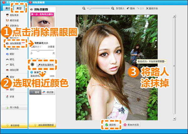 1、启动“美图秀秀“软件,并打开待处理的生活照。进入“美容”菜单,选用“消除黑眼圈”功能。选取周围相近的景色,先将抢镜的路人甲抹掉吧。