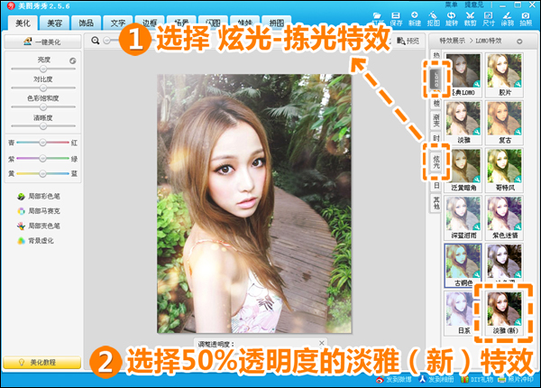 2、接着进入“美化”菜单下,先执行“炫光”分类下的“拣光”特效,再叠加“LOMO”分类下的“淡雅(新)特效,并将其透明度调至50%