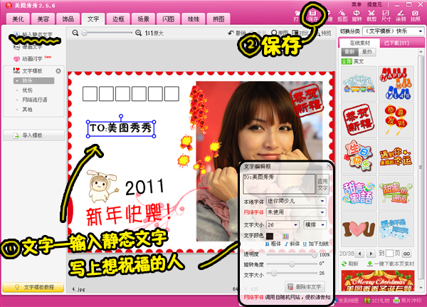 6、最后,到“文字”菜单下,利用“输入静态文字”将一些新年祝福语写在明信片的空白处。
