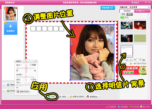 3、抠好图后,选择明信片背景,并调节前景照片的大小和位置,点击“应用”。