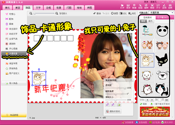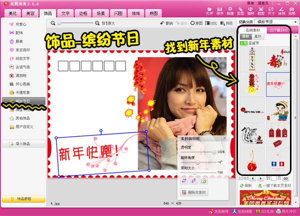 4、接着到“饰品”菜单下,在“缤纷节日”分类下找到新年素材,选中自己喜欢的素材并添加进图片中。