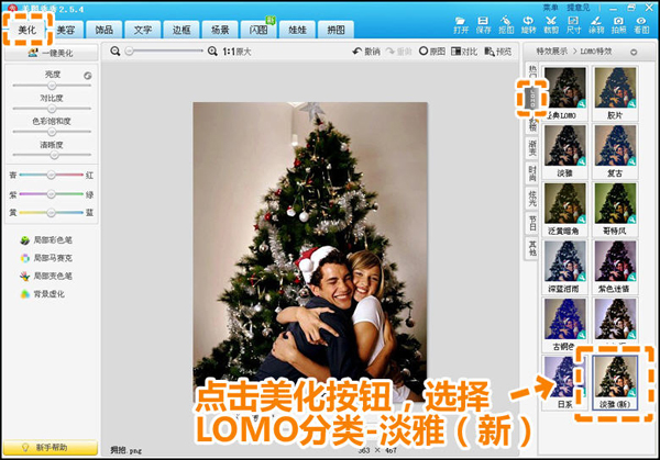 1.在“美图秀秀”软件下打开待处理的情侣合影,进入“美化”菜单下,选择lomo分类-淡雅(新),可以瞬间调节画面的色调和亮度。