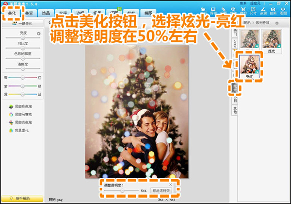 4.再进入“美化”菜单下,选择“炫光”分类中的“亮红”特效,并将透明度调到50%左右。