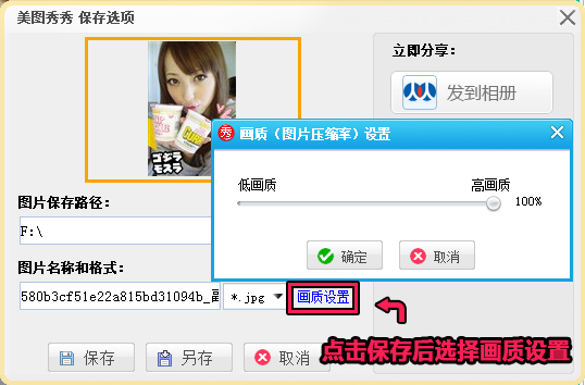 用美图秀秀处理好图片,单击“保存”按钮,弹出“美图秀秀保存选项”窗口,细心的朋友会发现新版美图秀秀新增了一个“画质设置”按钮,单击这个按钮,弹出“画质(图片压缩率)设置”小窗口,向右拖动滑块,将画质设置为100%,然后保存图片,就可以生成可以和PS媲美的高品质图像。