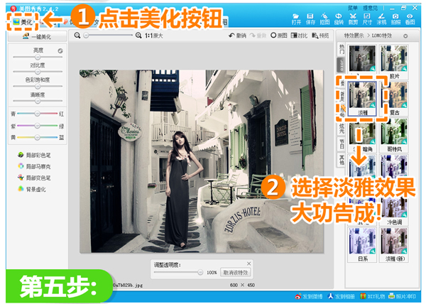 5、最后,再回到“美化”菜单,应用“淡雅”特效,让前景和背景的图片色调一致和谐。