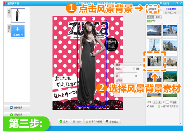 3、完成抠图后会自动跳转到编辑界面,然后点击“风景背景”,选择喜欢的风景素材。