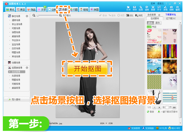 1、打开一张自己的照片,点击“场景”中的“抠图换背景”按钮。