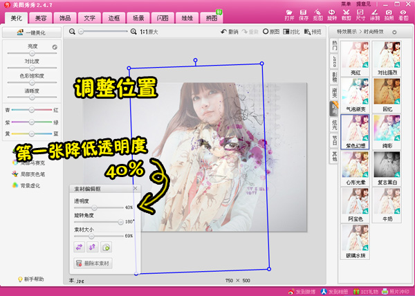 4、将刚才抠好保存的图片放进来,并调整位置和透明度,这里按亲的喜好自己决定哦。
