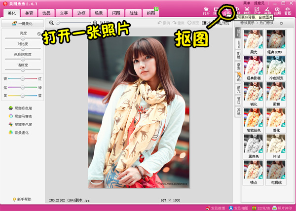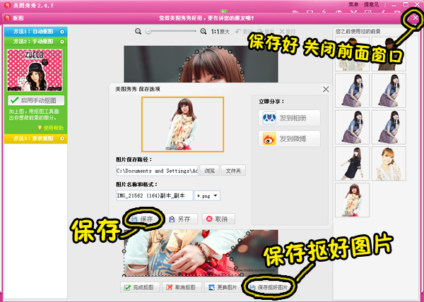 2、按编辑界面提示,用手动或者自动抠图将人物部分扣取出来,直接点击“保存抠好图片”按钮,将抠出的图片保存好备用。