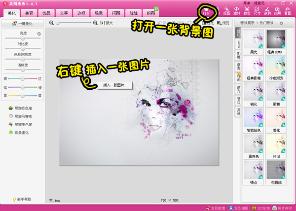 3、然后打开一张喜欢的图片做背景,点击鼠标右键“插入一张图片”。