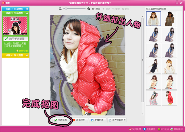 第二步:Yummy选择的是“手动抠图”,仔细抠出人物后,点击完成抠图。