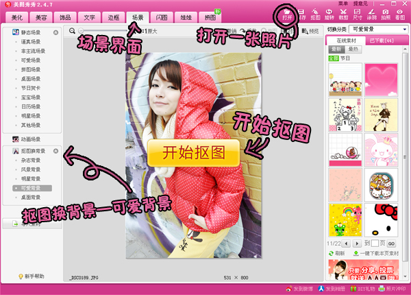 第一步:打开一张照片,点击“抠图”或者“抠图换背景”功能,先进行抠图。