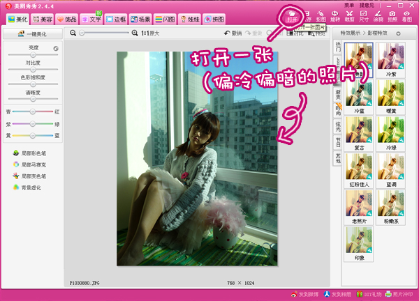1、在“美图秀秀”软件中打开一张偏冷偏暗的照片。