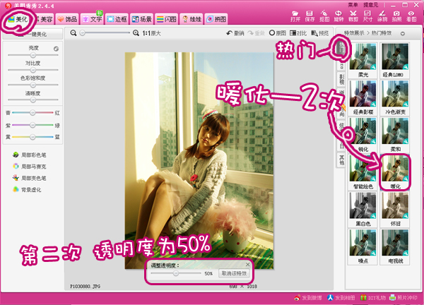 2、在“美化”菜单下,选择“热门”特效中的“暖化”两次,在第二次执行暖化特效时,并将特效透明度调至50%。