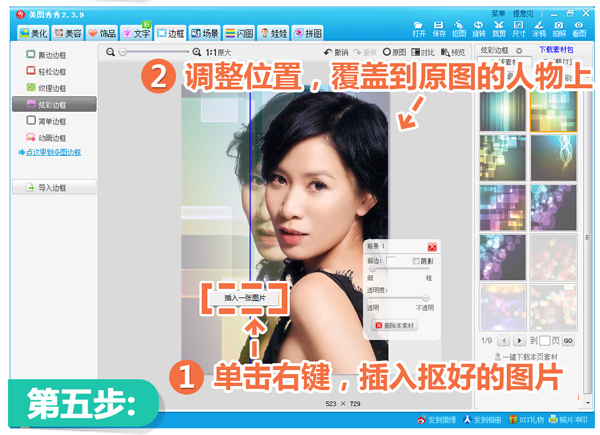 5、加好边框后,直接在图片上单击鼠标右键,点击“插入一张图片”将刚才抠好的图片插入进来。调整位置大小覆盖好原图的人物上,让炫彩边框效果只作用于人物背景中。如图6所示。