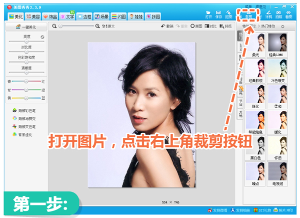 1、在软件中打开待处理的图片,小编喜欢佘诗曼,所以选择的是她的照片。然后点击界面右上角的“裁剪”按钮。如图2所示。