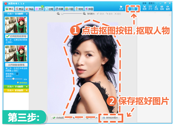 3、剪裁好后,再点击界面右上角“抠图”按钮,利用“自动抠图”抠出人物。抠图方法很简单,只需要按照左侧提示,在抠图区域画绿线,即可轻松确定抠图路径。最后将抠好的图保存到本地电脑中。如图4所示。