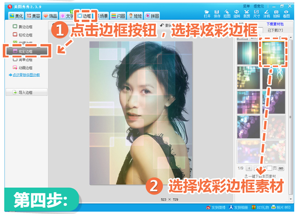 4、返回剪裁好后的图片状态后,进入“边框”菜单下,在“炫彩”边框中挑选一个方格炫彩边框。如图5所示。