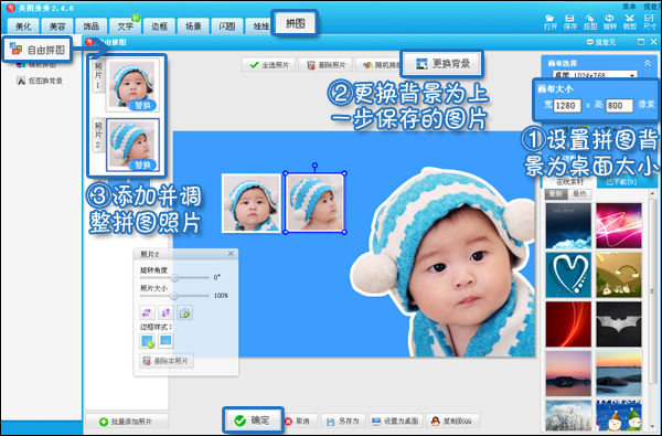 2、再打开另外一张宝宝照片,单击“自由拼图”。将拼图背景换成上一步保存的图片。然后妈妈们可以随自己的喜好多添加几张宝贝照片哦!