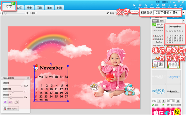 4、再进入“文字”菜单下,在“文字模板”—“其他”分类里,找到并添加喜欢的日历模板。最后再加上一些可爱的小饰品,满意后保存图片就可以设置为电脑壁纸咯!