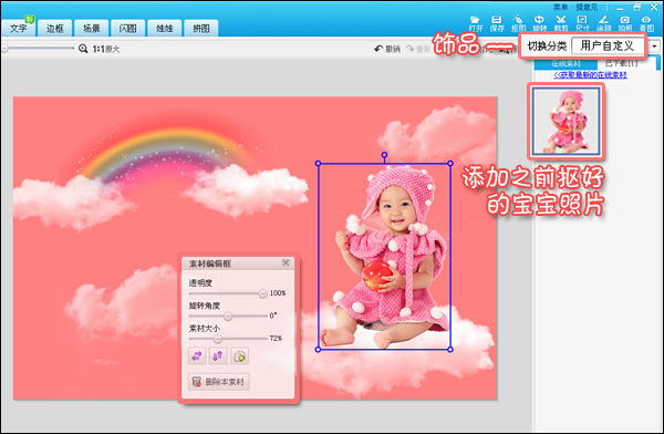 3、然后点击“用户自定义”分类下,将刚才作为前景素材的宝宝照片添加在云朵上。