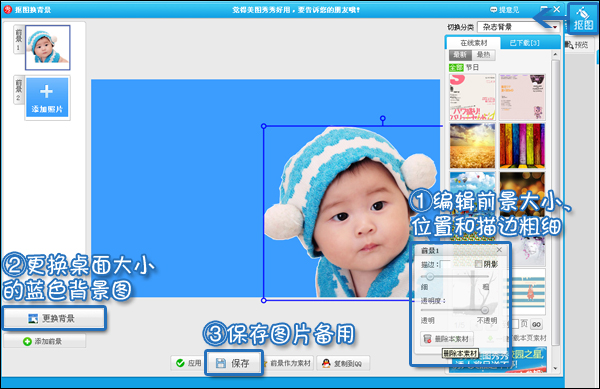 1、打开宝宝照片同样先进行抠图操作。然后在“抠图换背景”窗口给抠好的照片换上桌面大小的蓝色背景并保存备用。