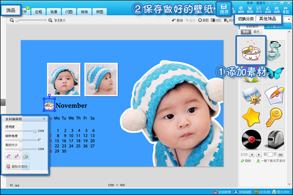 以上两个实例仅供妈妈们参考,其实“美图秀秀”软件里还有很多素材适合用来做宝宝壁纸,潮妈们只要多多尝试,一定能做出更多有创意的日历壁纸。制作过程不但能体验DIY的乐趣,看着电脑桌面换上了自制的可爱宝宝壁纸,也肯定小有成就感吧,哈哈!