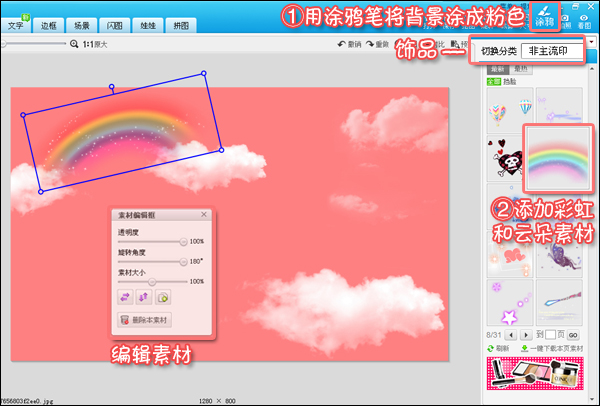 2、另外打开任意一张桌面大小的图片,使用涂鸦笔涂抹成粉红色。进入“饰品”菜单下,在“非主流印”分类中找到彩虹和云朵素材,并添加进图片中。