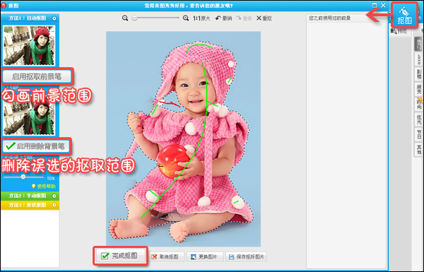 1、在“美图秀秀”里打开宝宝照片,使用“自动抠图”功能,将宝宝像抠出来后,单击“前景作为素材”,软件将自动将抠好的宝宝前景图片保存到“饰品”菜单下的“用户自定义”中。
